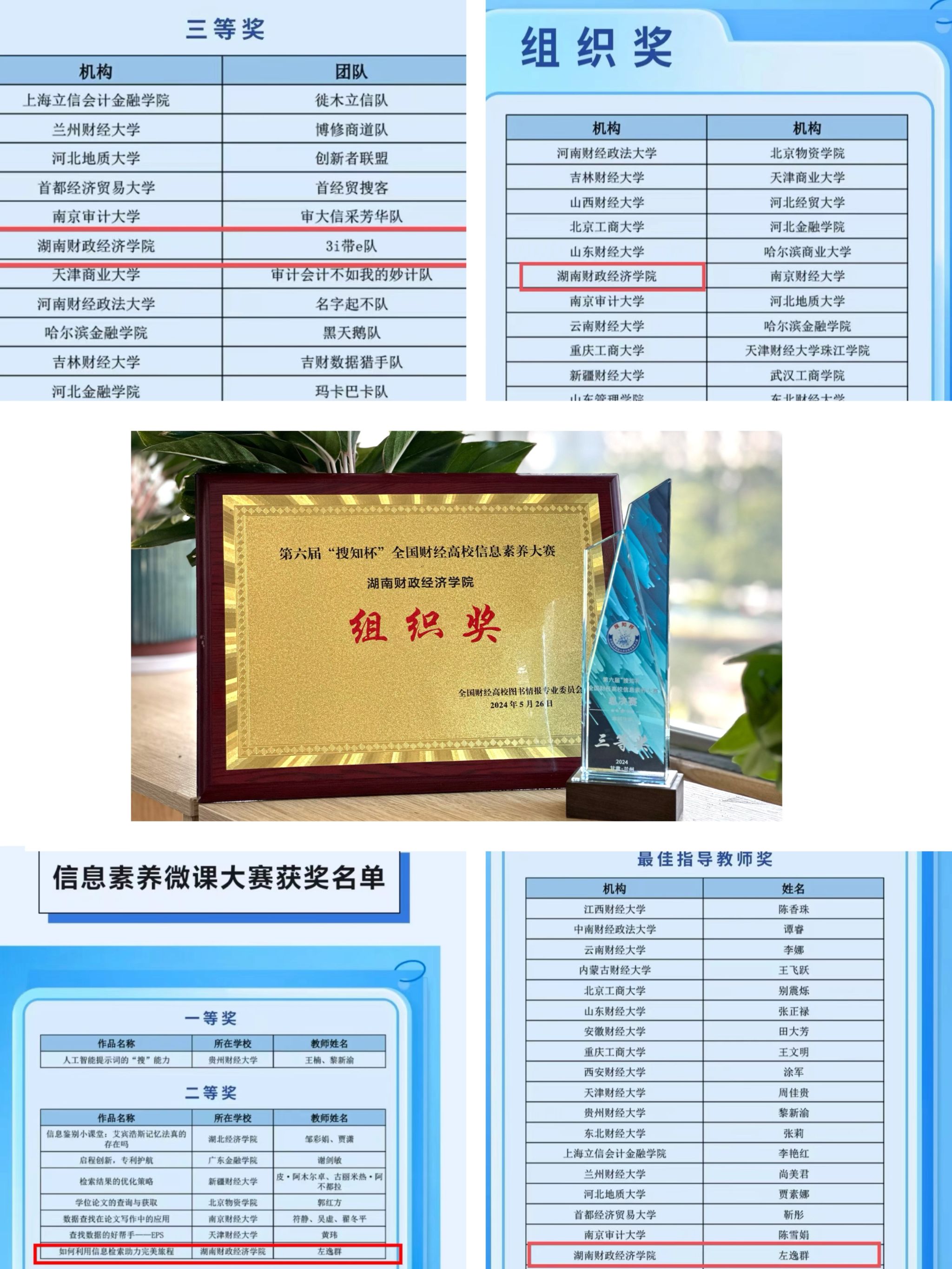 (本网讯)5月26日,第六届“搜知杯”全国财经高校信息素养大赛总决赛圆满落幕,世界杯官网与进入决赛的38支本科组队伍同台竞技,最终获得全国总决赛团体三等奖(本科生组),指导老师左逸群获得教师组微课大赛二等奖、最佳指导教师奖,学校获得组织奖。