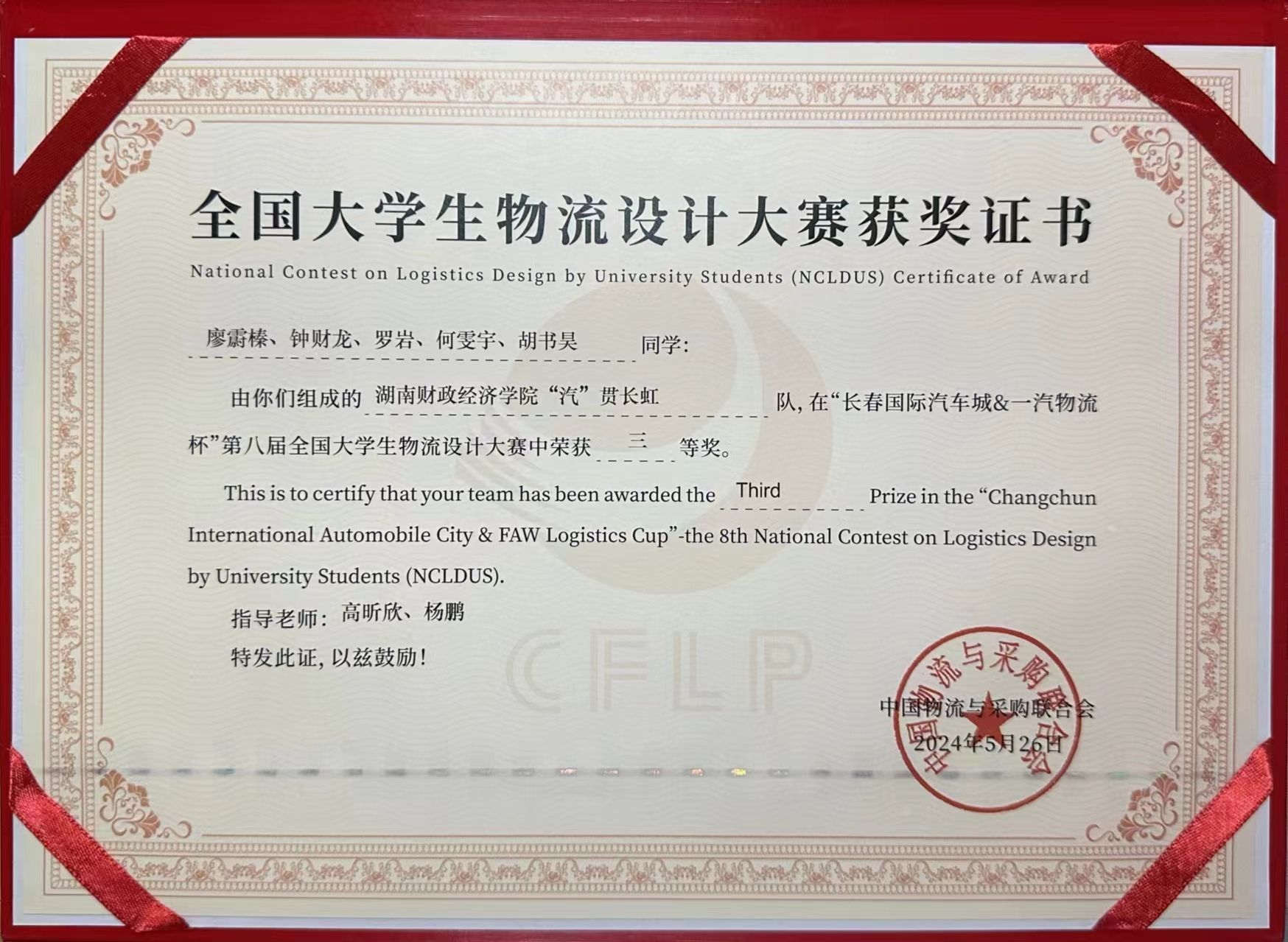 世界杯官网参赛团队“汽”贯长虹,由2022级物流管理专业的廖霨榛(队长)、何雯宇、胡书昊,2021级物流管理专业的钟财龙和2022级数据科学与大数据技术专业的罗岩5位同学组成,在工商管理学院高昕欣、杨鹏两位老师指导下,参赛作品《新质生产力赋能长春一汽物流园区高质量发展方案设计》荣获全国三等奖,5位同学获得《物流职业能力等级证书(中级)》。
