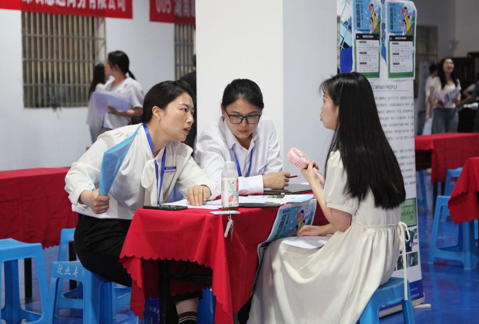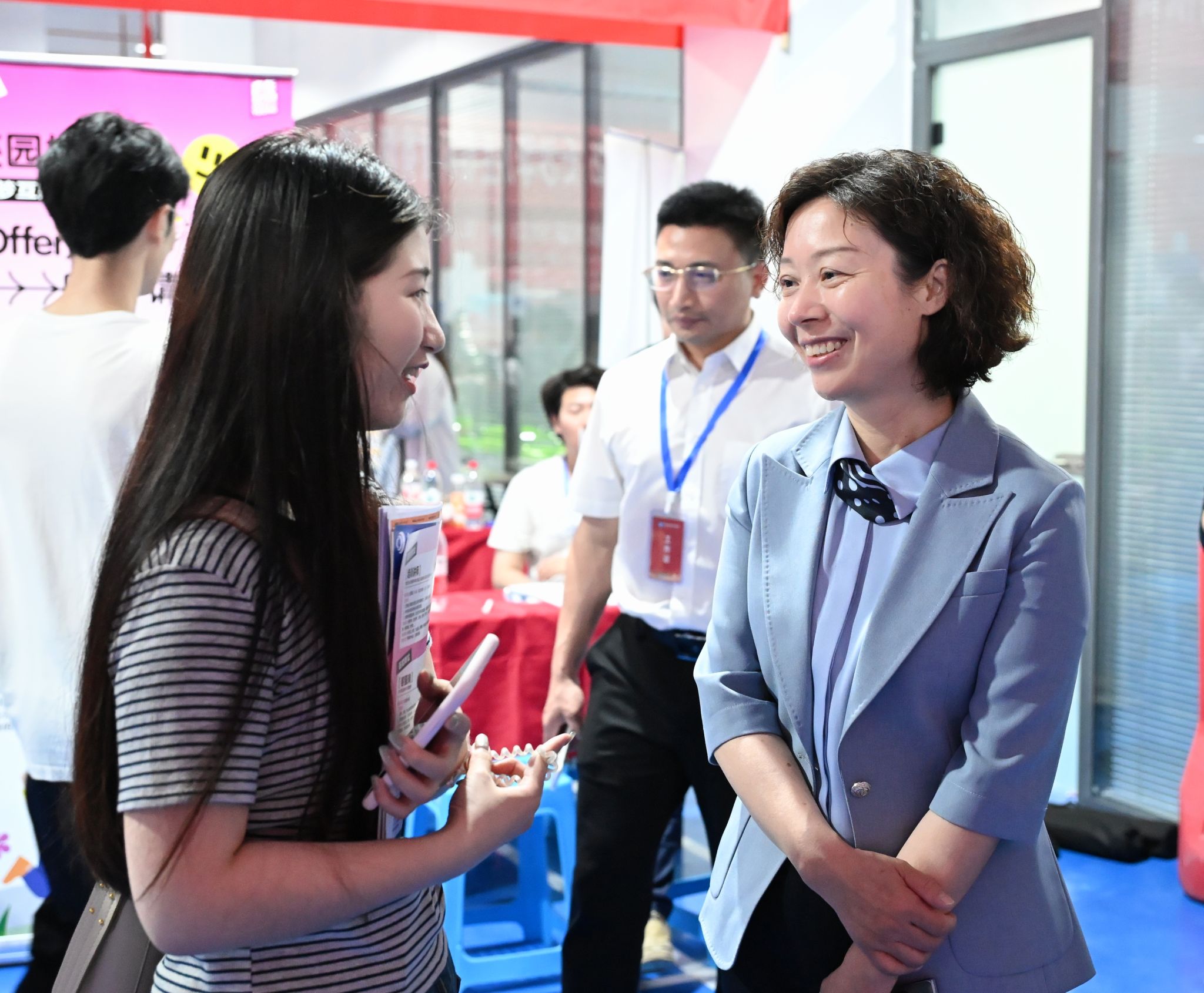 苏玲(左二)与用人单位交流 卢宣源/摄