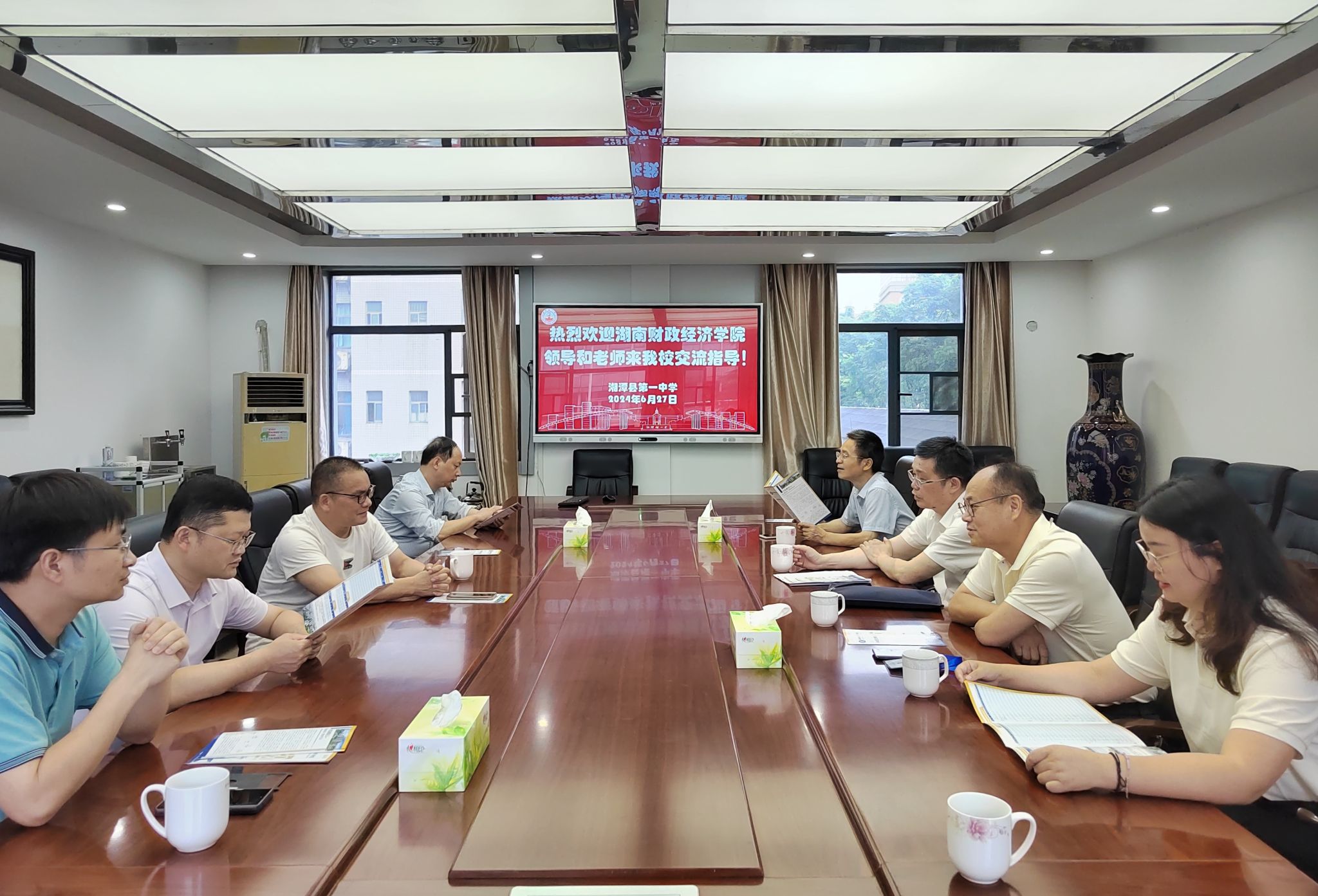 校长刘长庚(右三)与优质生源基地湘潭县一中负责人座谈