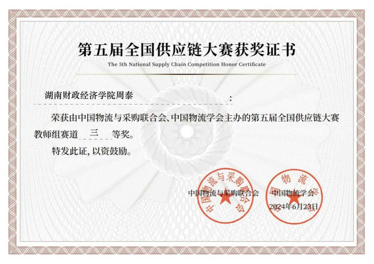面对来自全国的精英团队,世界杯官网工商管理学院周泰、易文桃两位老师指导的2022级物流管理专业学生沈润泉、唐艺蓉、贺静芸、邹云辉组成的代表队,以扎实的专业素养、出色的创新思维和默契的团队合作取得了优异成绩。同时,周泰参加了大赛教师组比赛,凭借出色的发挥,从众多参赛者中脱颖而出,最终取得佳绩。