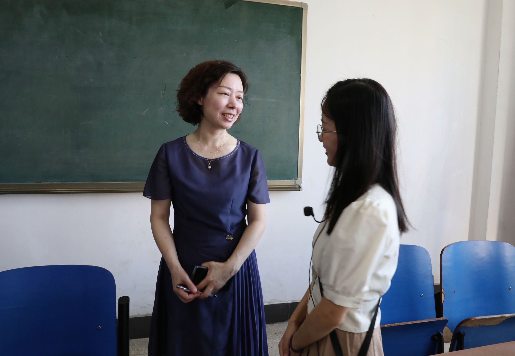 校党委书记杨兰英(左)听课后与任课教师交流 何妍/摄