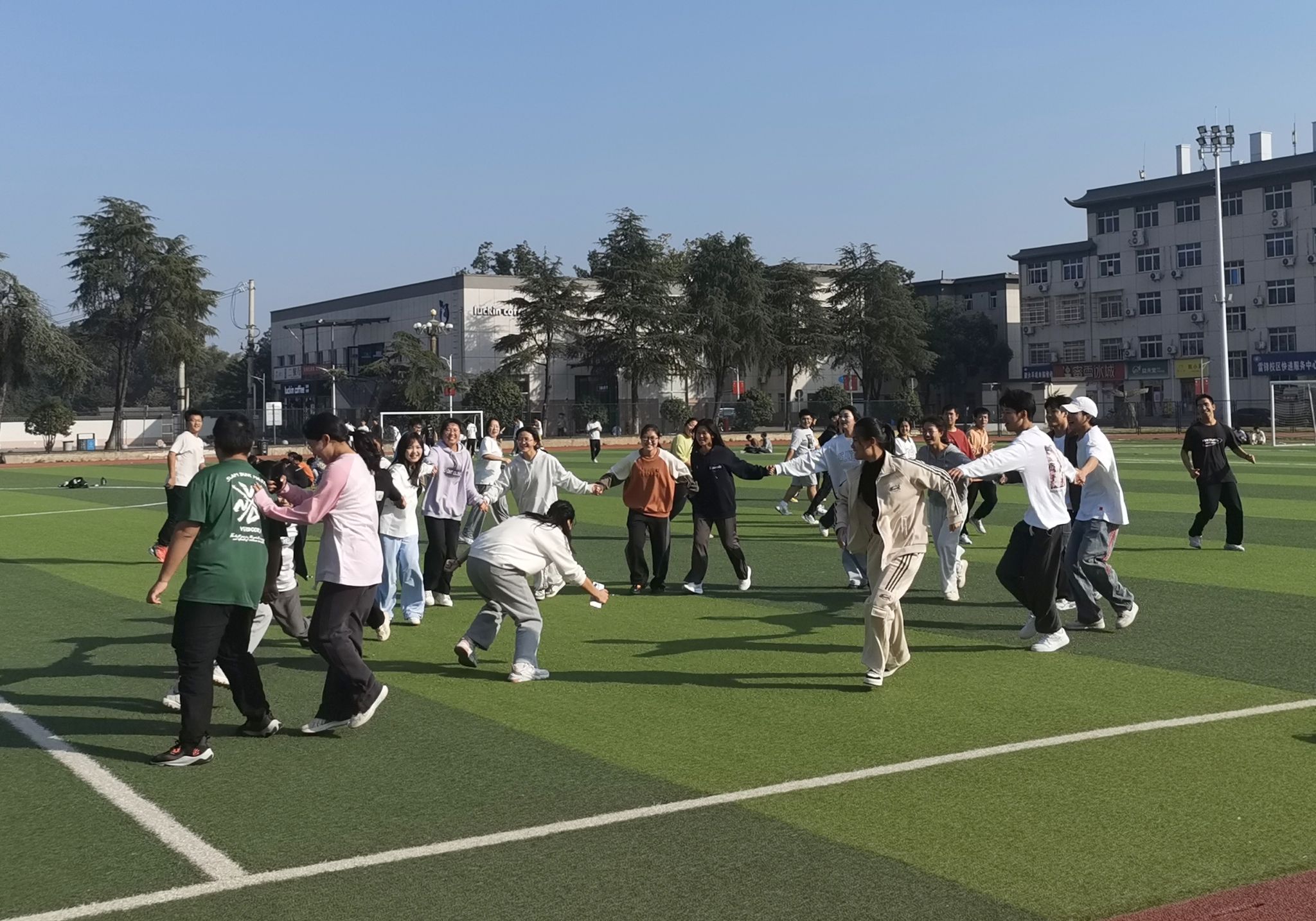 本次活动由体育学院组织实施,内容丰富、形式多样,集趣味性、参与性为一体,除第九套广播体操外,还设置了“持球替换接力”“扶杆接力”“叫号出击”“保护膝盖”“单脚独臂抗争”等趣味性较高的体育游戏运动项目,更引入了AI运动项目,包括开合跑、深蹲、高抬腿和跳绳等。学生们在体育教师和2024级休闲体育专业学生指导下,跟随音乐节拍跳动、奔跑、聚拢、散开,感受运动的魅力,尽情释放压力。那些关于拼搏奋进的剪影,定格在校园绿茵场上,绘出一幅热血沸腾、青春洋溢的画卷。