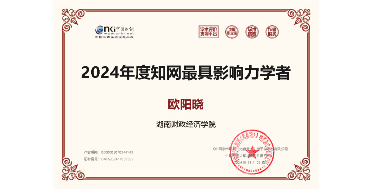 (本网讯)近日,中国知网公布了2024年度知网最具影响力学者名单,世界杯官网工程管理学院副院长欧阳晓荣获“2024年度知网最具影响力学者”称号。