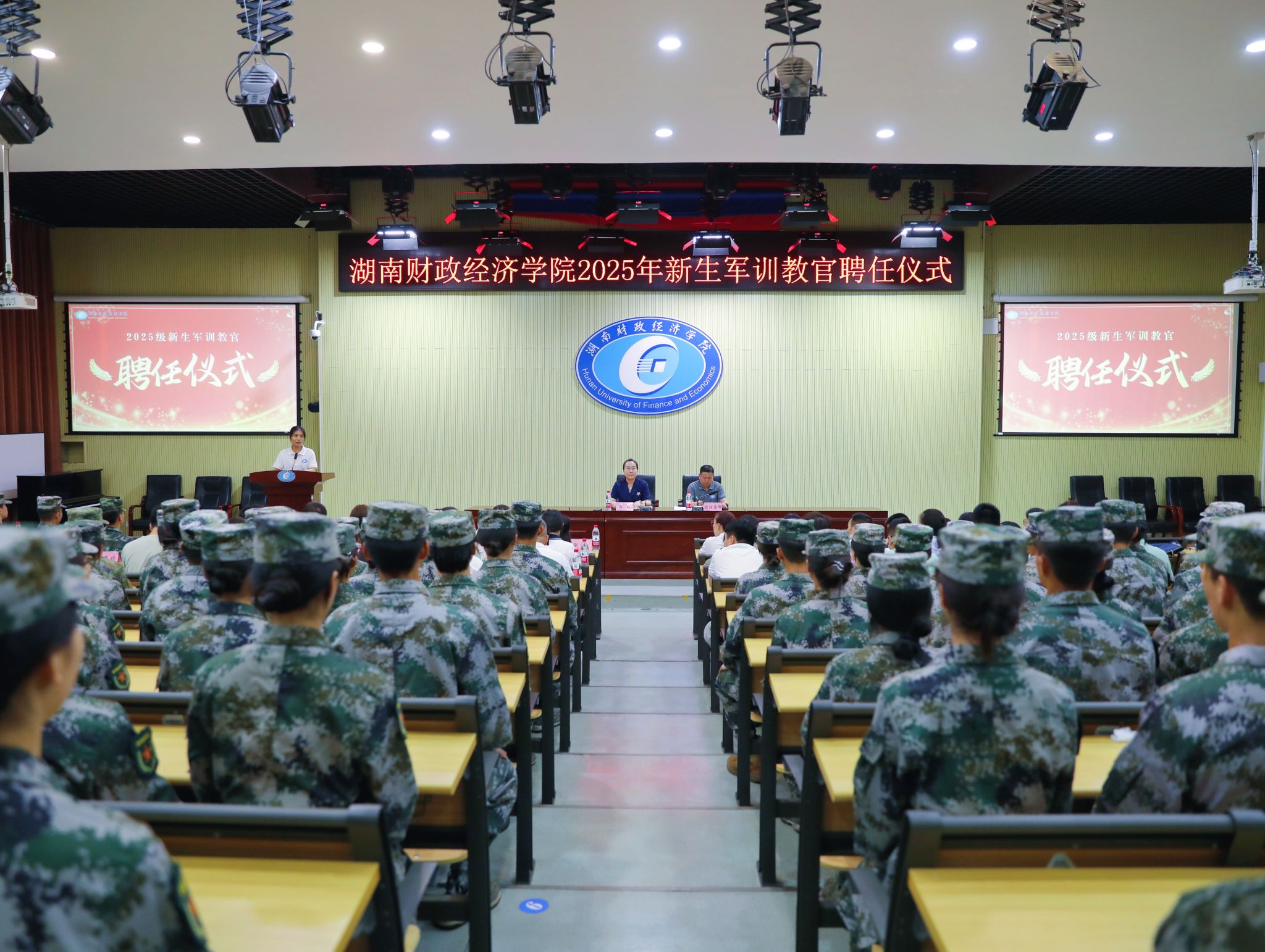 仪式在全体人员齐唱国歌声中拉开序幕。学生工作部部长欧阳海峰宣读2025级新生军训教官聘任文件,来自各二级学院的90名在校生被正式聘任为军训教官,其中包括10名退役复学学生。各二级学院学工负责人为受聘教官颁发了聘书。