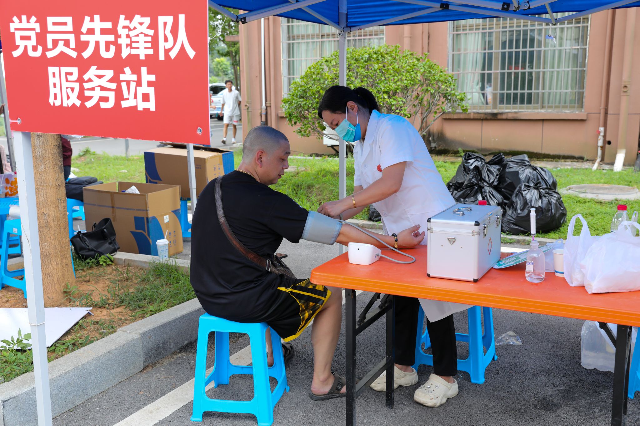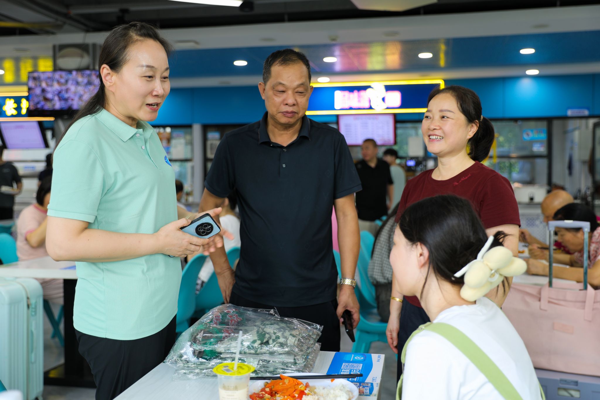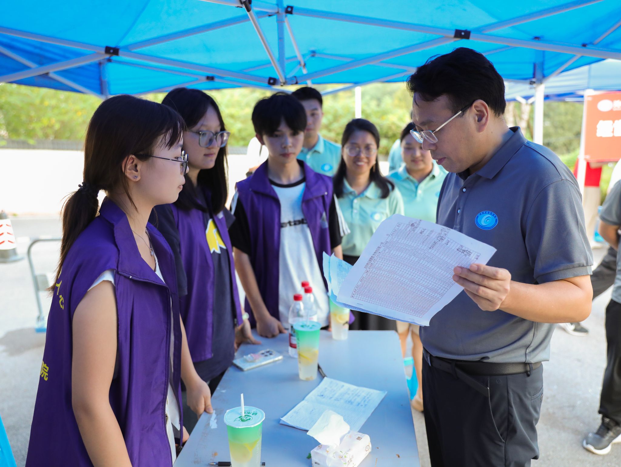 校园入口处,转运车自清晨至日暮不间断运行,有序接送新生及家长。车刚停稳,身着红马甲的志愿者们便主动上前接过行李,热情引路:“前面就是报到区,宿舍和食堂都离这儿不远,我带您过去看看!”党员先锋队服务站的党员师生亮明身份、争做表率,不仅提供细致的引导咨询和基础医疗支持,还贴心准备了茶饮等防暑物资,为远道而来的新生和家长送去一份清凉。