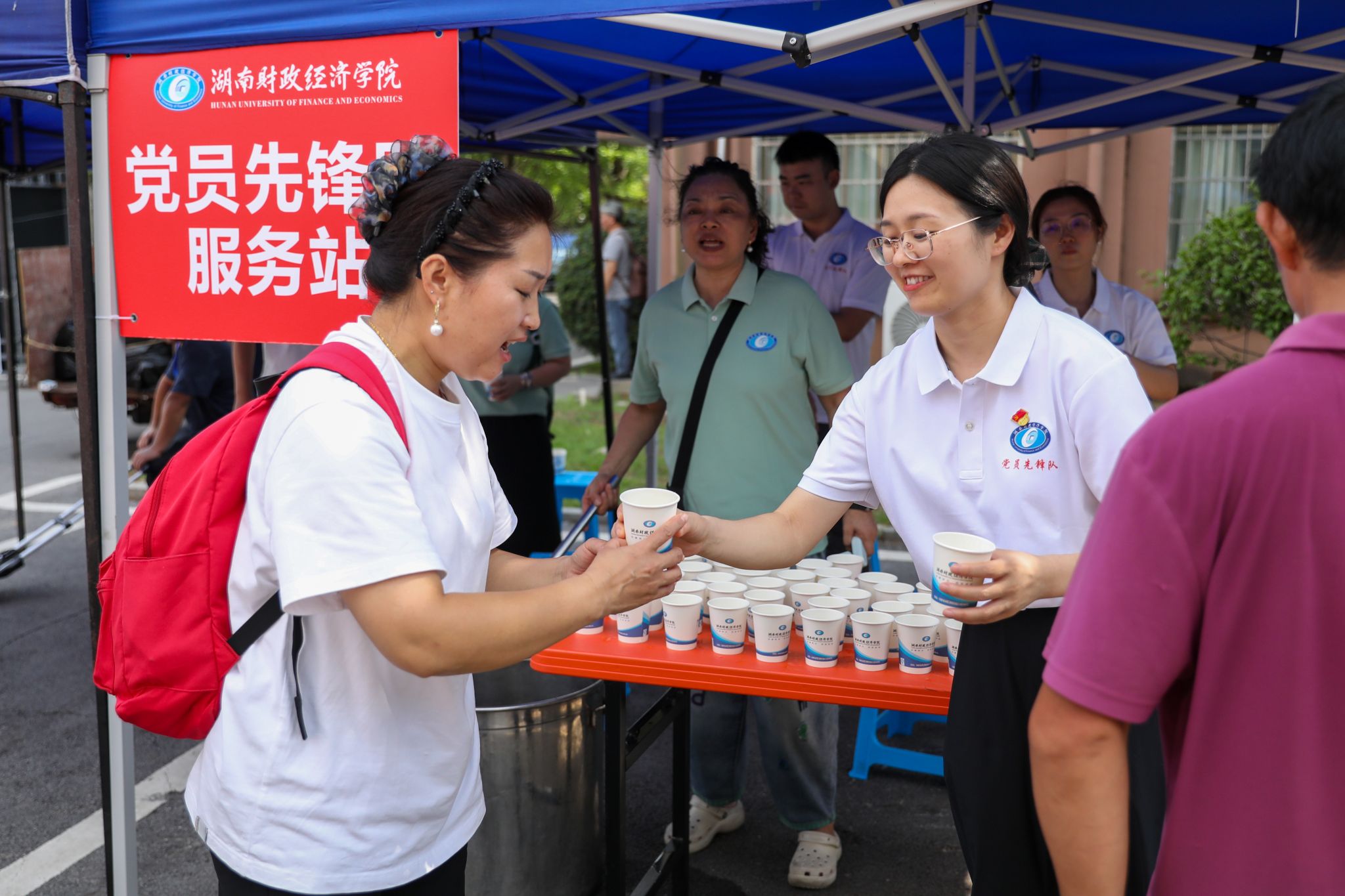 党员先锋队队员为新生家长送上茶水 马致炫/摄