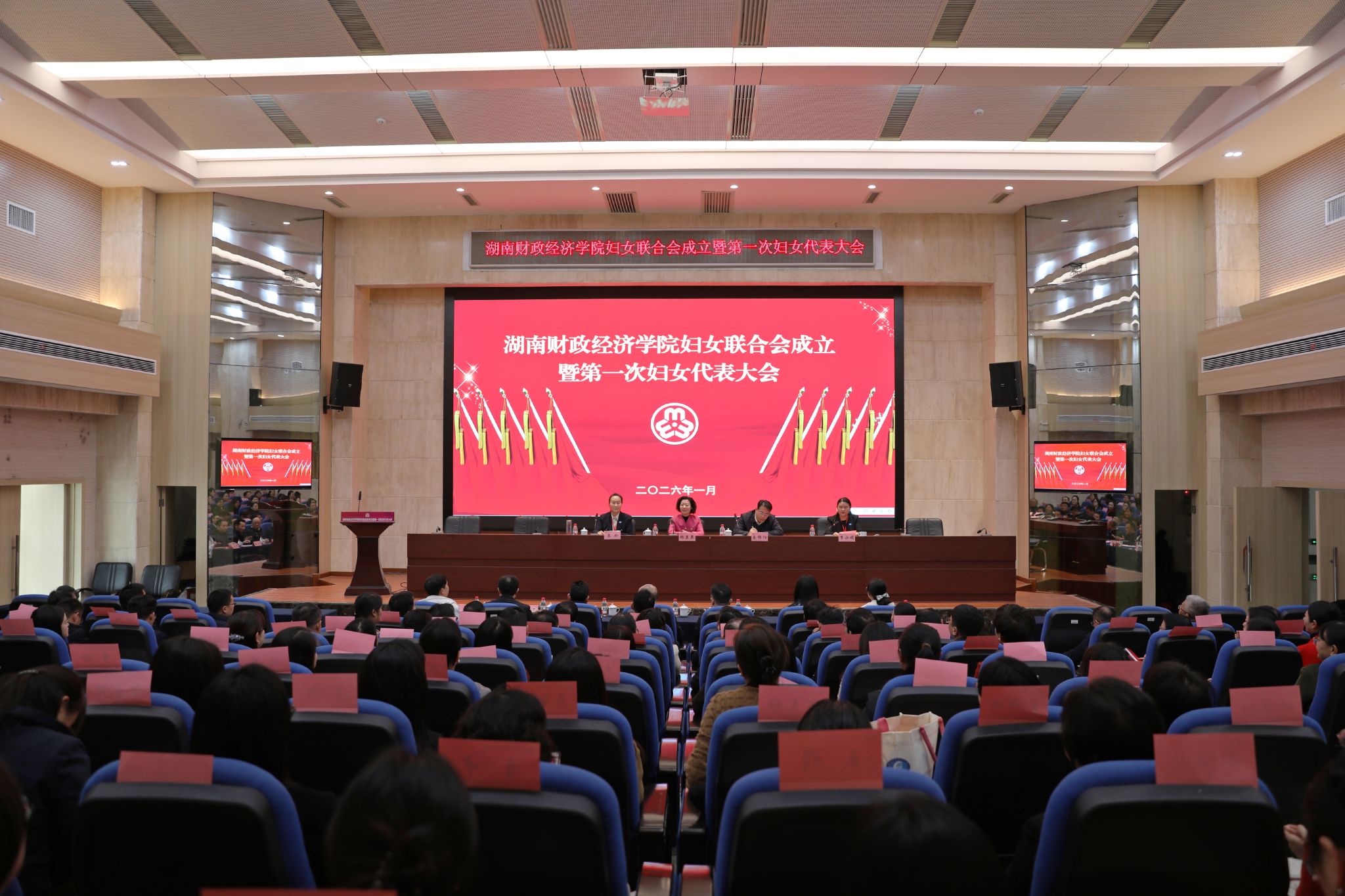 (本网讯)1月16日上午,学校妇女联合会成立暨第一次妇女代表大会在图书馆学术报告厅召开。湖南省妇联党组书记、主席杨兰英,校党委书记易棉阳出席会议并讲话。全体在校校领导,中层正职干部,100余名女性教职工、学生代表以及列席代表参加会议。副校长李小娟主持会议。