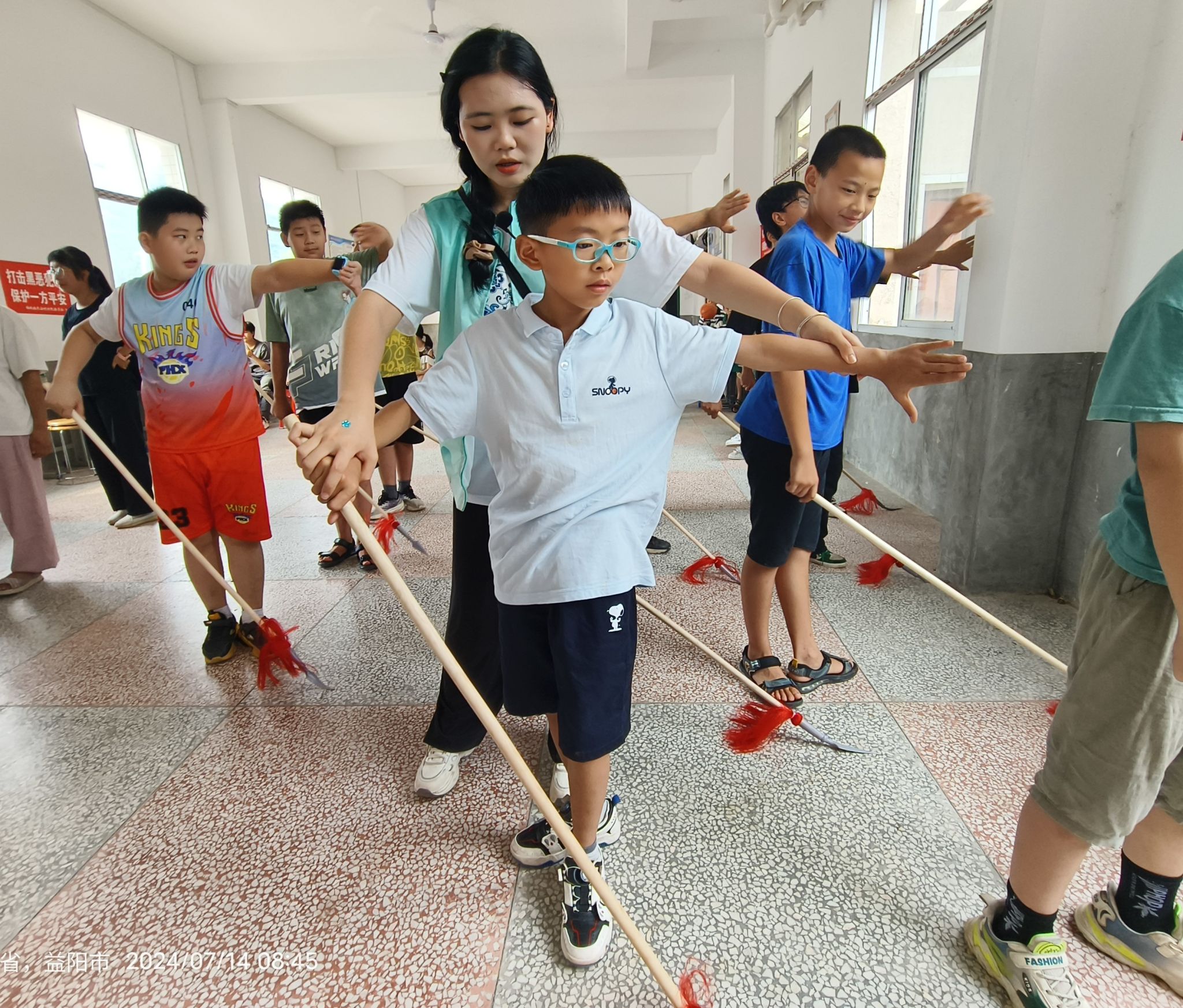 祁剧,也叫“祁阳戏”“楚南戏”,因发祥于湖南省祁阳县而得名。祁剧十八枪,包括单枪、双枪及皮球枪等枪法。学生们在志愿者们的带领下,从热身开功到逐一学习枪法、枪式。通过热身开功、复习旧课、新授枪法等环节,孩子们在反复练习中逐渐感受到了祁剧枪法的独特魅力与韵律之美,真正体验到祁剧作为国家级非物质文化遗产的独特韵味与文化价值。