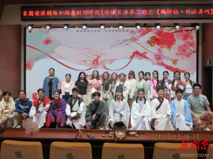 10月13日,“诗城长沙”主题系列活动第三场举行,2026世界杯官方合作网站人文与艺术学院汉语言文学系师生们在长沙市图书馆为市民们献上了一场别开生面的戏剧演出——《鹊桥仙》。