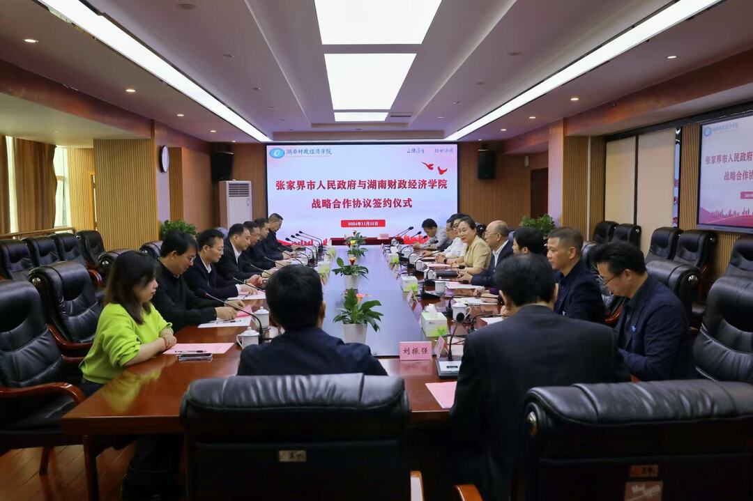 苏玲简要介绍了学校办学历史、办学特色、办学成效和办学愿景。她表示,学校和张家界市人民政府有长期交流合作的基础,建立了深厚友谊。此次双方签订战略合作框架协议,充分体现了张家界市人民政府对学校建设发展的重视与支持,揭开了校地携手奋进、协力共赢的新篇章。当前,学校正全面贯彻党的二十届三中全会精神,深入实施深化学校教育综合改革,构建“文体并进”育人新模式,答好“两个融合”命题,擦亮湖财金字招牌。学校和张家界市人民政府合作基础深厚、前景广阔,希望双方强化战略对接、互相赋能,共同探索合作协同创新机制,在产学研合作、文旅体合作、干部教育培训、招生就业实习、促进乡村振兴及地方经济发展等多个领域开展全方位、深层次合作,产出更多高质量合作成果,为国家、社会培养更多优秀人才、为实现“三高四新”美好蓝图作出更大贡献。