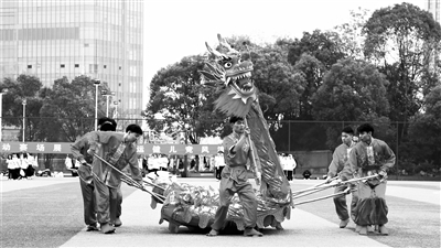 学生在运动会开幕式上进行舞龙舞狮表演。 汪洋 摄