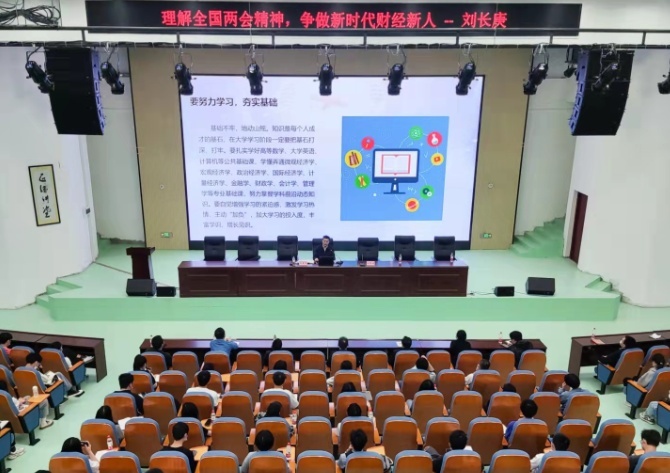 在雷锋校区至诚楼L1114教室,刘长庚为雷锋学院学生作“理解全国两会精神,争做新时代财经新人”专题讲座。刘长庚指出,每年召开的全国两会是我国政治生活中的一件大事,是中国特色社会主义民主政治制度的重要载体,充分保障了人民权益、体现了人民意志。刘长庚从2021年我国国民经济和社会发展取得的成绩、2022年政府工作“七大”目标和“九项”重点任务等方面切入,对2022年政府工作报告和预算报告进行了深入浅出的解读,用通俗易懂的语言向学生阐释了CPI、PPI、碳中和、财政政策、货币政策等指标与概念。刘长庚强调,自1978年改革开放以来,我国经济保持了年均9%以上的增长速度,人均GDP突破1万美元,从低收入国家迈入中等偏上收入国家行列。当代青年是接过全面建设社会主义现代化国家历史接力棒的骨干力量,希望同学们立鸿鹄伟志、守报国丹心,勤于读书明理、打牢坚实基础,实现知识、能力、素质和价值的有机统一,为实现中华民族伟大复兴的中国梦贡献力量。