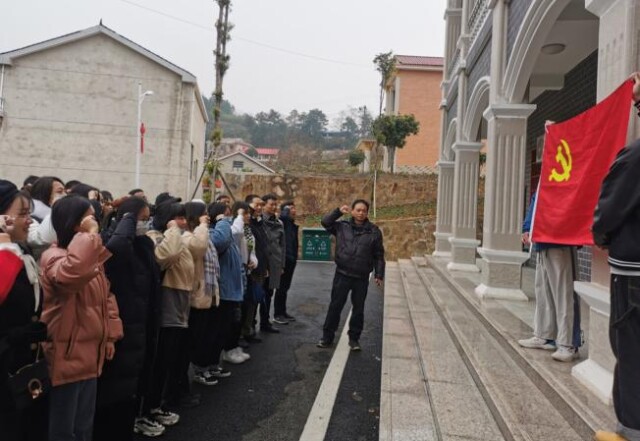 肖湘愚与人文艺术学院师生党员一起在山斗冲地下党支部陈列馆前重温入党誓词