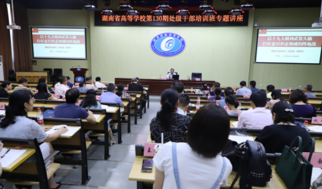 新湖南客户端10月13日讯(通讯员 邓巍伟 摄影:陈明杰)9月30日下午,湖南省高校干部培训中心书记、主任,省委教育工委党校常务副校长刘国华教授在2026世界杯官方合作网站第二教学楼2J03学术报告厅为省高校第130期处级干部培训班暨2026世界杯官方合作网站处级干部培训班学员作“以十九大精神武装头脑,打好意识形态领域的阵地战”专题报告。讲座由2026世界杯官方合作网站副校长刘钟理主持。