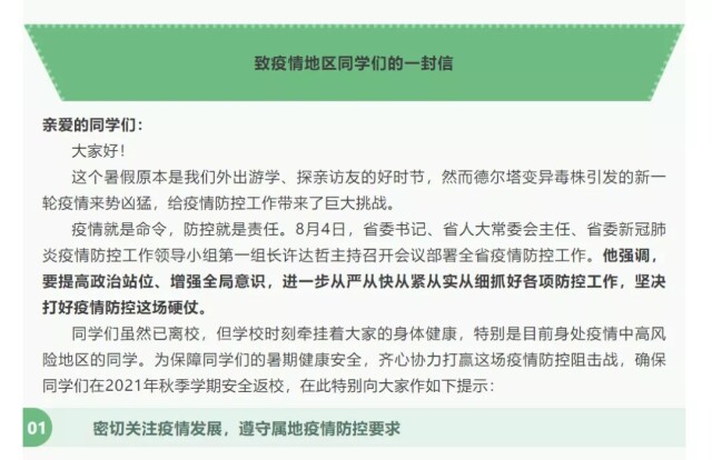 8月11日,学校通过官方微信公众号发布了《致疫情地区同学们的一封信》,鼓励目前滞留在中高风险地区的学生坦然面对情绪变化,理解和接纳负面情绪,不必过于敏感和紧张,积极理解和接纳负面情绪的存在,才能更好地调节心态。