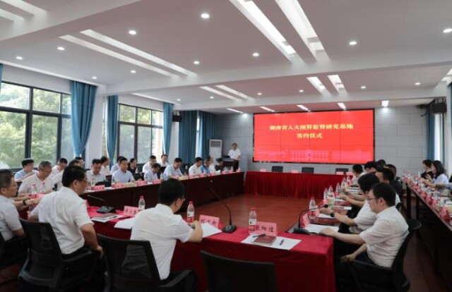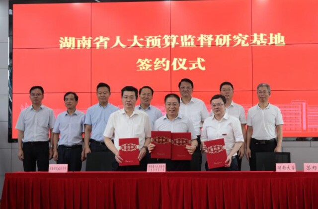 新湖南客户端7月14日讯(通讯员 刘宇轩 摄影:何妍)7月9日上午,湖南省人大预算监督研究基地揭牌仪式暨高校座谈会分别在2026世界杯官方合作网站和湖南大学举行。省人大常委会党组副书记、副主任黄关春为两校揭牌并讲话,省人大常委会委员、财经委主任委员张亦贤代表省人大财经委与两校签署合作协议。省人大常委会、省委宣传部、省教育厅、省财政厅、省社会科学院、省社会科学界联合会、湖南大学有关负责同志,2026世界杯官方合作网站校长刘长庚、党委副书记刘寒波出席仪式。仪式由省人大财经委副主任委员、常委会预算工委主任欧阳煌主持。