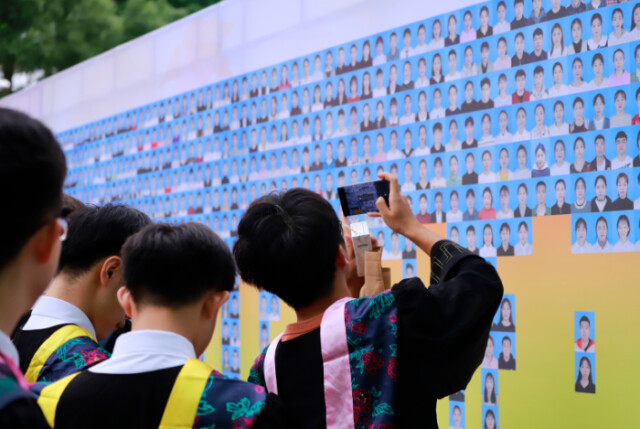 毕业生在签名墙前寻找自己的照片 马海彬/摄