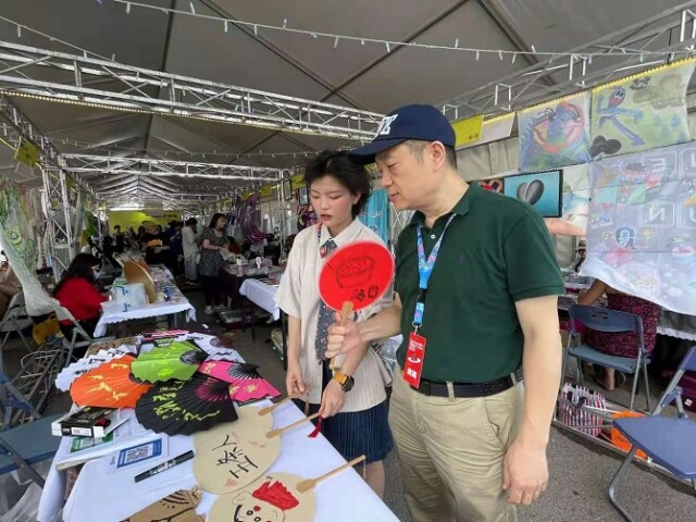 随后,肖湘愚来到“扇风点火”潮玩快闪店了解情况。“扇风点火”由人文与艺术学院师生共同打造,将网络流行语点缀于凉扇上,融合吐槽风尚、凉风解乏、音乐跃动、情绪标签的元素,设计了一套套契合音乐节受众群体的文创产品。
