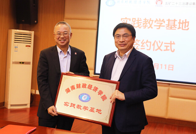 副校长郭国强(右)授予五矿二十三冶“实践教学基地”牌匾