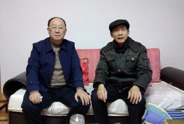 校领导赵鹤平(左)走访慰问老党员颜学根(右)