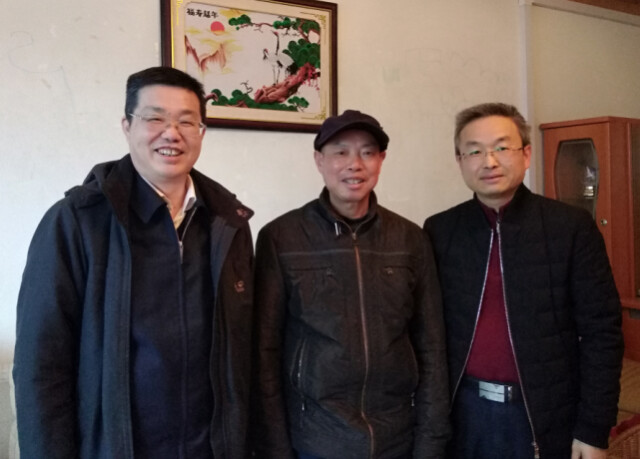 校领导刘长庚(左)和校领导刘钟理(右)走访慰问老党员彭子美(中)