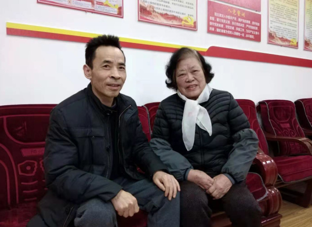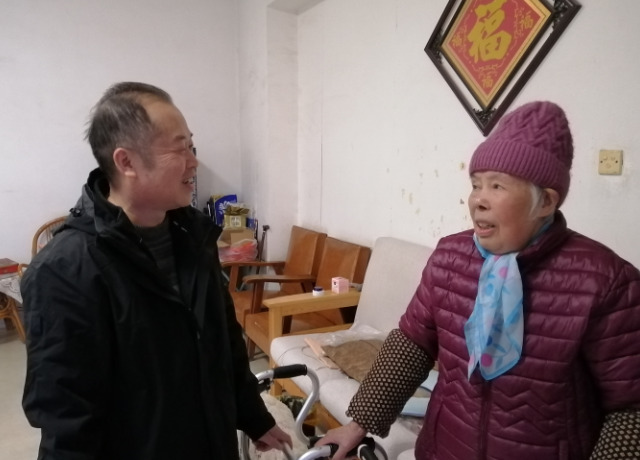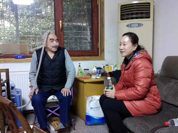 校领导苏玲(右)走访慰问老党员邱谓中(左)