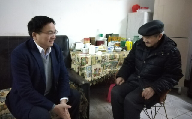 校领导李雪山(左)走访慰问老党员张爱元(右)