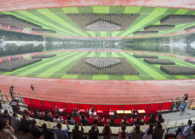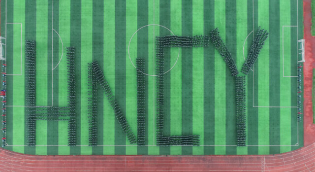 “向右看!”“1、2、3、4!”伴随着激昂的《分列式进行曲》旋律,20个新生军训方阵喊着铿锵有力的口号,迈着坚实有力、整齐划一的步伐依次通过主席台,接受学校领导的检阅。受训新生良好的精神风貌充分展示了学校军训的成果,向教官、向学校、向父母交上了一份满意的答卷。在汇报表演的压轴环节,由千余名新生组成创新方阵,用“中国”“HNCY”“I love U”“轮船”等图案,表达对祖国母亲和学校的热爱。