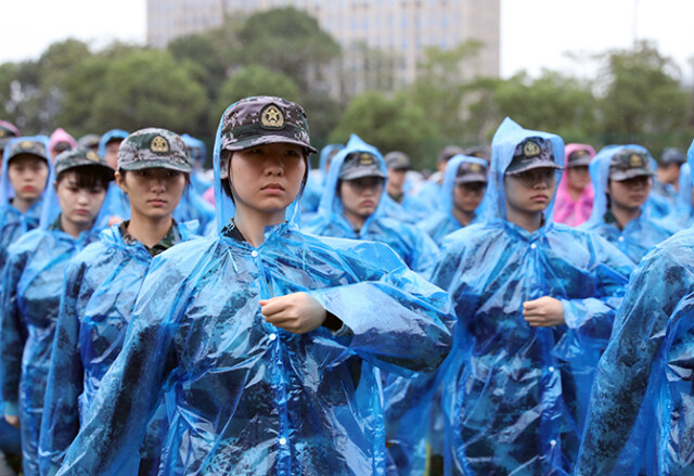 冒雨坚持训练的新生们