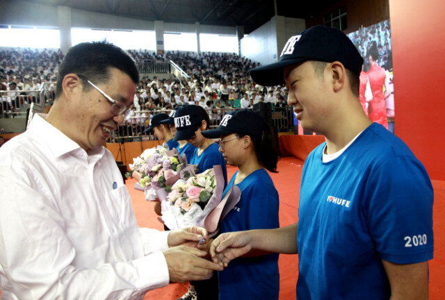 在全场师生的见证下,肖湘愚、刘长庚亲手为当天年满18周岁的9名新生佩戴校徽并赠送鲜花,庆祝他们18岁成人生日、祝贺他们正式成为“财院人”。“能够被授予校徽,内心十分激动,更多的是荣幸与斗志,我对大学生活更为充满期待,我将更加努力学习为报效祖国,回报父母、学校与社会。”2020级信息技术与管理学院何佳说道。