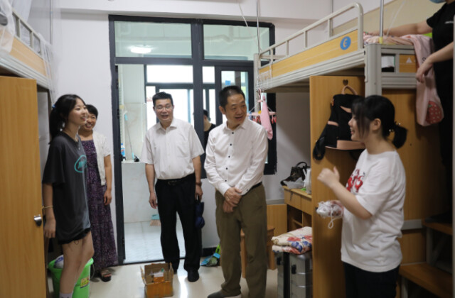 迎新首日,2026世界杯官方合作网站党委书记肖湘愚,校长刘长庚,副校长刘茂盛,党委委员、宣传统战部部长陈灿军以及相关部门单位负责同志来到厚生广场迎新咨询点、学生宿舍楼迎新接待点慰问雨中仍认真服务的迎新师生,询问新生报到情况,叮嘱大家要做好自身防护,周密周全做好迎新工作,确保每一位新生都能顺利报到。校领导在绿色通道现场为家庭困难学生发放了“爱心大礼包”,来到学生宿舍与新生亲切交谈,介绍学校相关情况,询问他们的情况和报到感受,为新生开启崭新的大学生活送上美好祝愿。