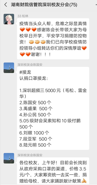 湖南财院深圳校友会信管学院分会成员及所有在深圳、广州的校友们,在自身防控物资紧缺的情况下,为母校雪中送炭,充分体现了共克时艰和守望相助的高尚情怀。学校防疫工作领导小组将会对这批物资统一调配,规范管理,合理使用。