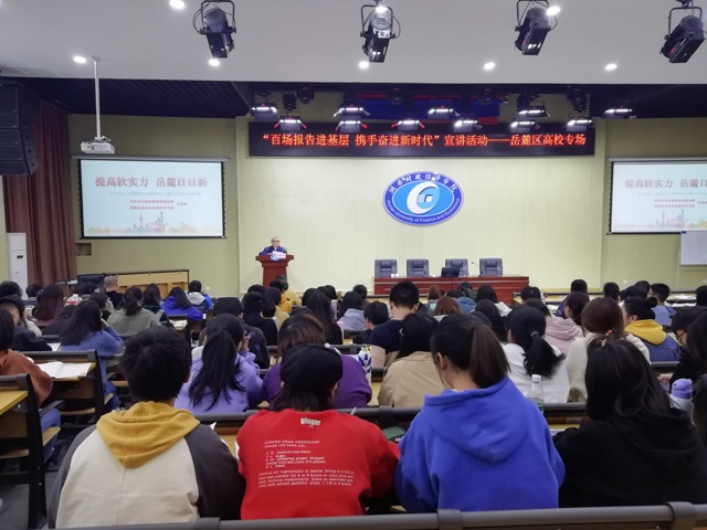 湖南日报·新湖南客户端11月28日讯(通讯员 姚旭辉)11月20日下午,岳麓区“百场报告进基层、携手奋进新时代”宣讲高校专场活动在湖南财院二教阶梯三教室举行。湖南财院党委委员、组织部部长兼党校常务副校长王颖梅、机关党总支书记姚旭辉,岳麓区委组织部、岳麓区老干部局工作人员以及学校2019年下半年党校学员参加活动。