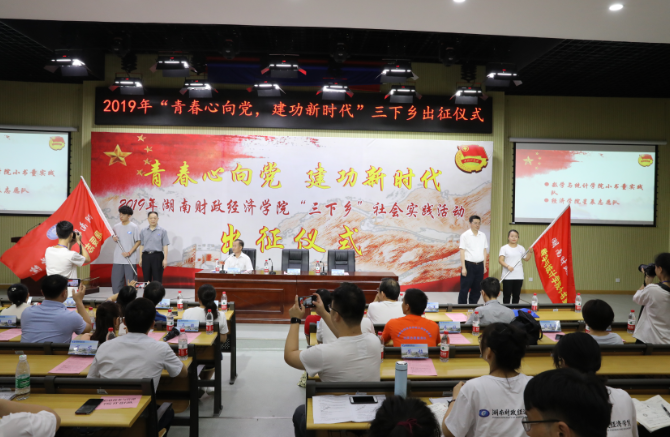 湖南日报·新湖南客户端7月2日讯(通讯员 王佳惠 向惠 摄影 汪洋)6月28日下午,湖南财院2019年“青春心向党,建功新时代”暑期“三下乡”社会实践活动出征仪式在二教学楼阶梯三教室举行。湖南财院党委书记肖湘愚,校长刘长庚,副校长刘茂盛,党委委员、宣传统战部部长陈灿军,马克思主义学院党总支书记、院长钟奇江,各二级学院党总支副书记、团总支书记,“三下乡”团队指导老师及全体志愿者参加仪式。仪式由刘茂盛主持。