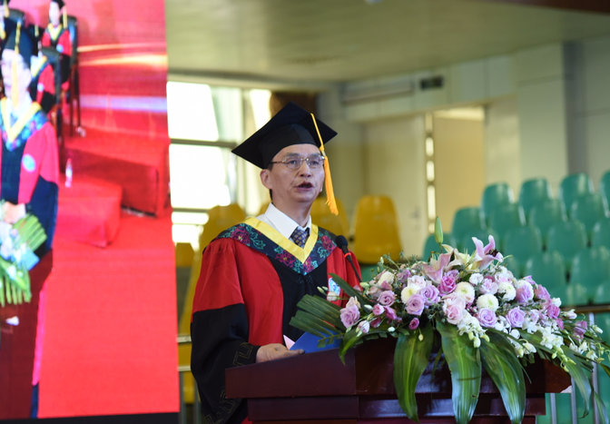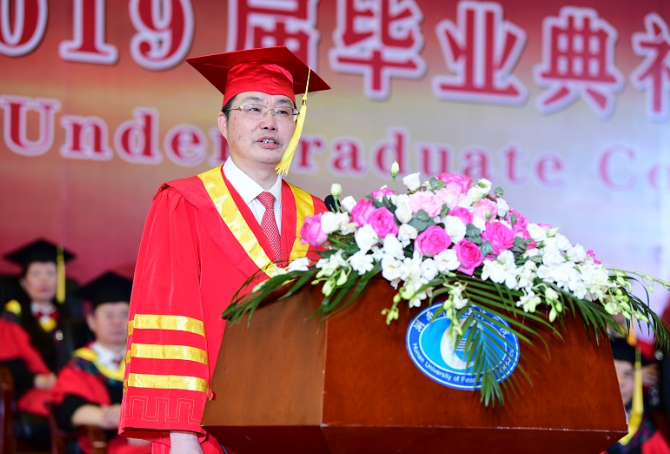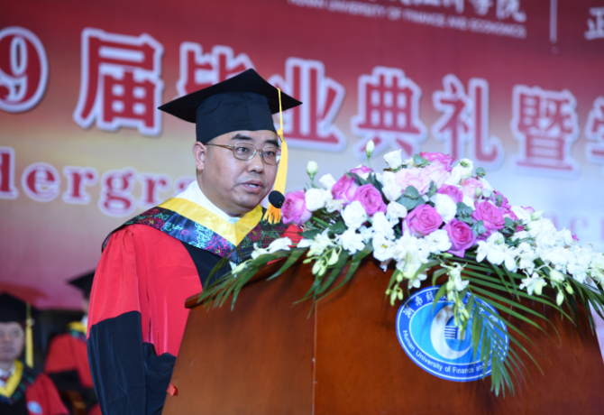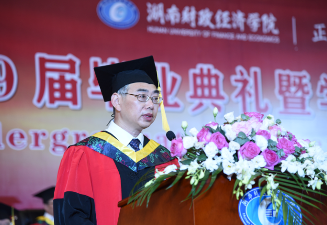 典礼上,湖南财院校长刘长庚发表了“新时代 新使命 新担当”主题致辞。面对现场的毕业生们,他殷殷嘱托,“‘正德、厚生、经世、济用’的校训孕育出了我们学生的爱国情怀。你们是和新时代一同成长的一代,你们的理想、本领和担当关系着国家和民族的未来。”他希望毕业生们坚持将远大理想和国家命运有机统一,树立远大理想,以主人翁的姿态为国奉献;坚持爱国和爱党、爱社会主义的有机统一,把爱国情、强国志、报国行自觉融入坚持和发展中国特色社会主义事业、建设社会主义现代化强国、实现中华民族伟大复兴的奋斗之中;坚持担当和奋斗的有机统一,拿出不畏艰难、迎难而上的勇气、毅力和恒心,在奋斗中绽放青春芳华;坚持“德”和“才”的有机统一,明大德、守公德、严私德,始终坚守正确的世界观、人生观和价值观,将“正德厚生、经世济用”的校训始终牢记在心。他的承诺“不管大家今后身在何地、身处何境、身遇何事,学校永远欢迎你们回家。”让现场毕业生感动不已。