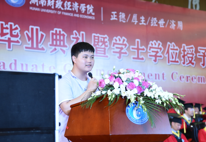 教师代表外国语学院黄欢老师上台发言时,台下她教过的学生们开始欢呼。她用学校英文名的缩写“HUFE”, 表达了对毕业生们的期望,即“Hopeful” “Useful”“Faithful”“Enjoyful”。她希望大家坚定梦想, 忠于自我,享受和珍惜生活中的每一天,并将学到的知识回馈社会,做一个对社会有用的人。2015级国际经济与贸易专业三班刘博文作为毕业生代表上台发言,他回忆起自己从一名懵懂无知的少年,成长为了一名睿智果断的中国共产党员,而这一切都来自学校的孕育、老师的教导以及同学的帮助。“在外界的苍穹里,愿你们也能鹰击长空,自由飞翔。”2018级财务管理二班邹沁宇代表在校生表达了对即将毕业的学长学姐的祝福。湘潭市民生银行行长、湖南财院杰出校友代表文跃群对再次回到母校感到心潮澎湃,他回忆了在财院的四年大学时光,并与毕业生们分享了他的体会,“学会感恩”“人生需要奋斗”“把握现在”是他给学弟学妹们的三条人生感悟。