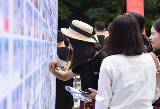 典礼结束后,大家纷纷跑去与老师们合影纪念,叙旧道别。在馆中,湖南财院宣传统战部何妍老师正在为2015级房地产开发与管理班金远亮同学整理学士服和流苏,祝福毕业。“宣传统战部的老师无论是在学业还是生活中,都给予了我很多指导与帮助,特别是何老师,给予了很多关怀,很感谢他们。”金远亮说道。“妈妈能来参加我的毕业典礼真是太好了。”现场一位母亲在毕业典礼结束后,欣喜地拿出手机给女儿拍照,记录下女儿成长的时刻。能够见证女儿大学四年的收获时刻,她表示十分欣慰。“大学给予我最大的礼物,就是让我遇见你”。一对情侣在签名墙边合影。女生手捧男生送给她的鲜花,学校见证了他们坚贞的爱情。道别不仅仅是去到现场,还有许多无法赶到现场的财院学子,通过观看直播来向母校道别。据悉,学校2019届毕业典礼暨学士学位授予仪式受到了新湖南的高度关注,新湖南APP平台头条向全网直播典礼盛况,30万人次在线观看直播,截至21时总访问量近100万。