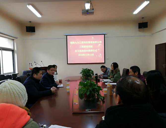 新湖南客户端12月20日讯(通讯员 章艳宇)12月13日上午,湖南财院工程管理学院与湖南楚林地理信息研究院有限公司、长沙思源(世远)房地产经纪有限公司、中科高盛咨询集团有限公司、湖南九为工程项目管理有限公司共建教学实践基地签约暨授牌仪式在湖南财院办公楼217会议室举行。湖南财院副校长刘茂盛,工程管理学院院长李德祥、副院长王旭红、副院长罗永恒、党总支副书记刘绿丝,教务处副处长汪小英以及企业代表参加活动。
