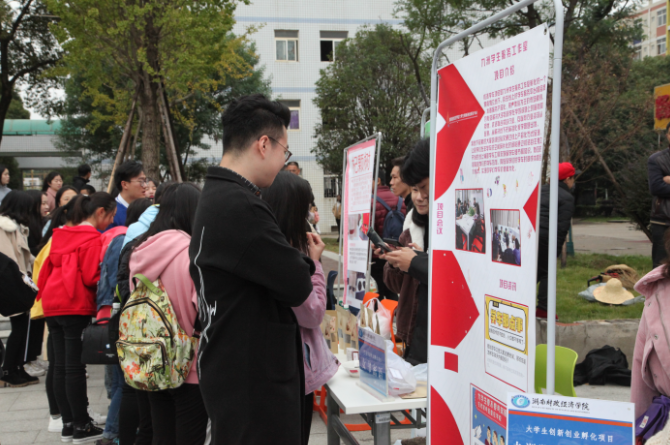 新湖南客户端11月12日讯(通讯员 汤婧婧 张思思 李民栋 摄影 张思思 何妍 王欣怡)11月8日,由湖南财院招生与就业创业指导处、校团委联合主办的首届创新创业宣展会在学生活动广场举行。