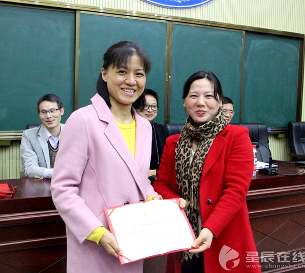 (人文与艺术学院总支副书记周志望[右]为陈敏利博士[左]颁发星辰学通社指导老师聘书。)