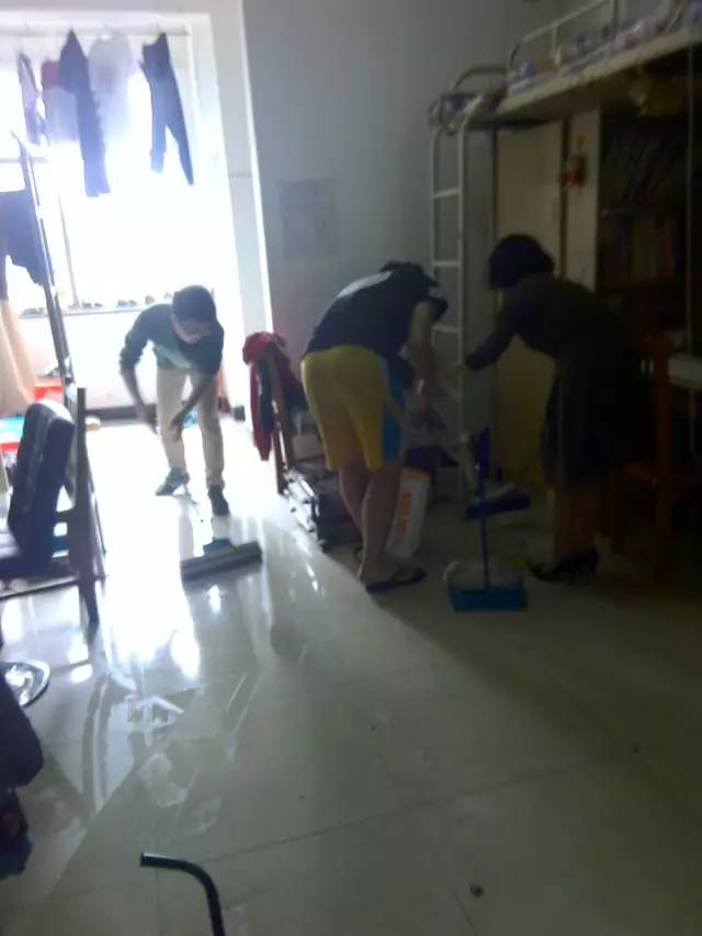 辅导员亲自拿起扫把、拖把进行卫生清洁。
