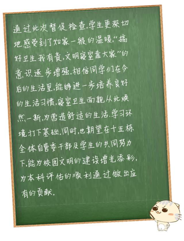 检查过程中发现,学生对检查工作的重视度和积极性大有提高,能够提前十分钟开门热情地迎接辅导员的到来。有的辅导员在检查时,认真、细心地指出了各间寝室还存在的不足,并现场指导学生进行整改。
