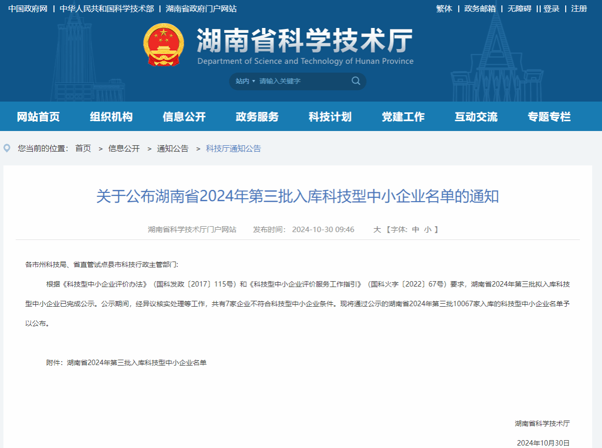 (本网讯)10月30日,湖南省科技厅发布了《关于公布湖南省2024年第三批入库科技型中小企业名单的通知》,公司正式被认定为“科技型中小企业”。继被认定为“高新技术企业”之后,公司再次收获一项省级荣誉。