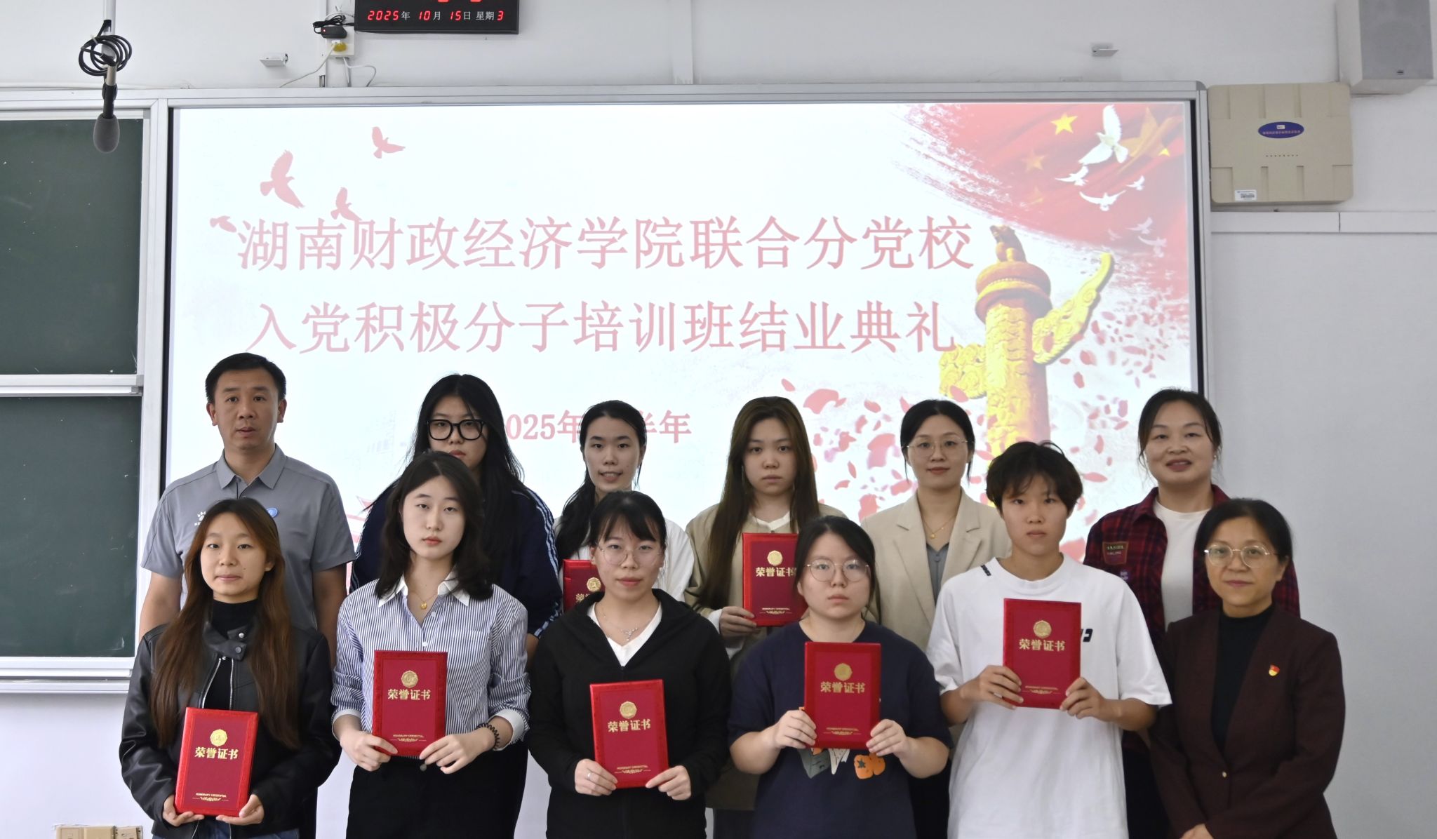 (本网讯)10月15日下午,学校联合分党校2025年下半年入党积极分子培训班结业典礼在主校区第二教学楼2217教室举行。机关第十一党支部入党积极分子屈佳怡在联合分党校培训班中表现突出,态度认真、积极学习,获得了“优秀学员”荣誉称号。
