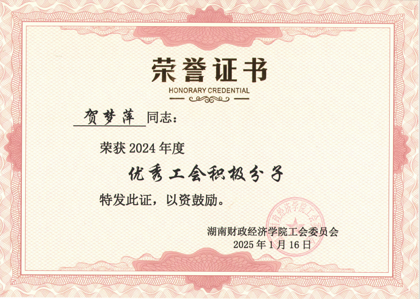 (本网讯)1月16日,校工会公布《关于表彰2024年度工会工作先进单位、优秀文体协会、优秀工会干部和优秀工会积极分子的决定》(湖财工发〔2025〕1号)。公司4人荣获省2024年度“优秀工会积极分子”荣誉称号。他们在不同岗位,作为工会活动的推动者和团队凝聚力的强化者,为工会工作的顺利推进贡献了不可或缺的力量。