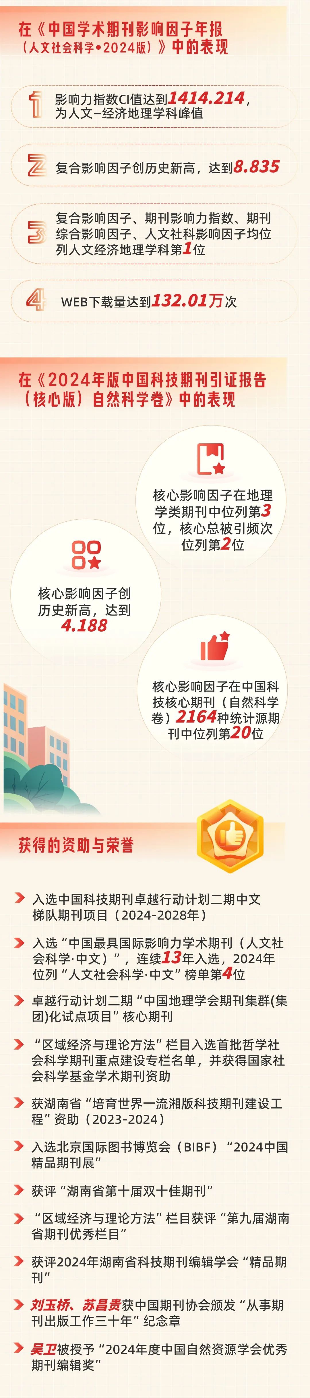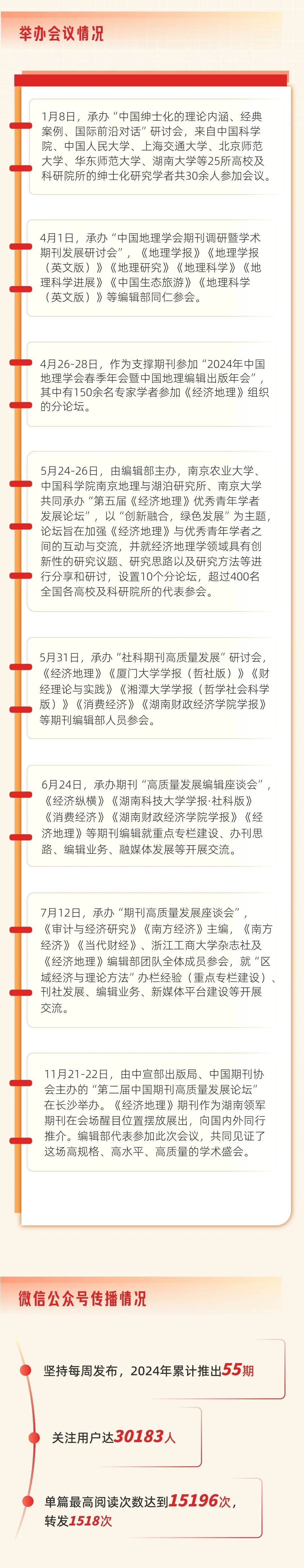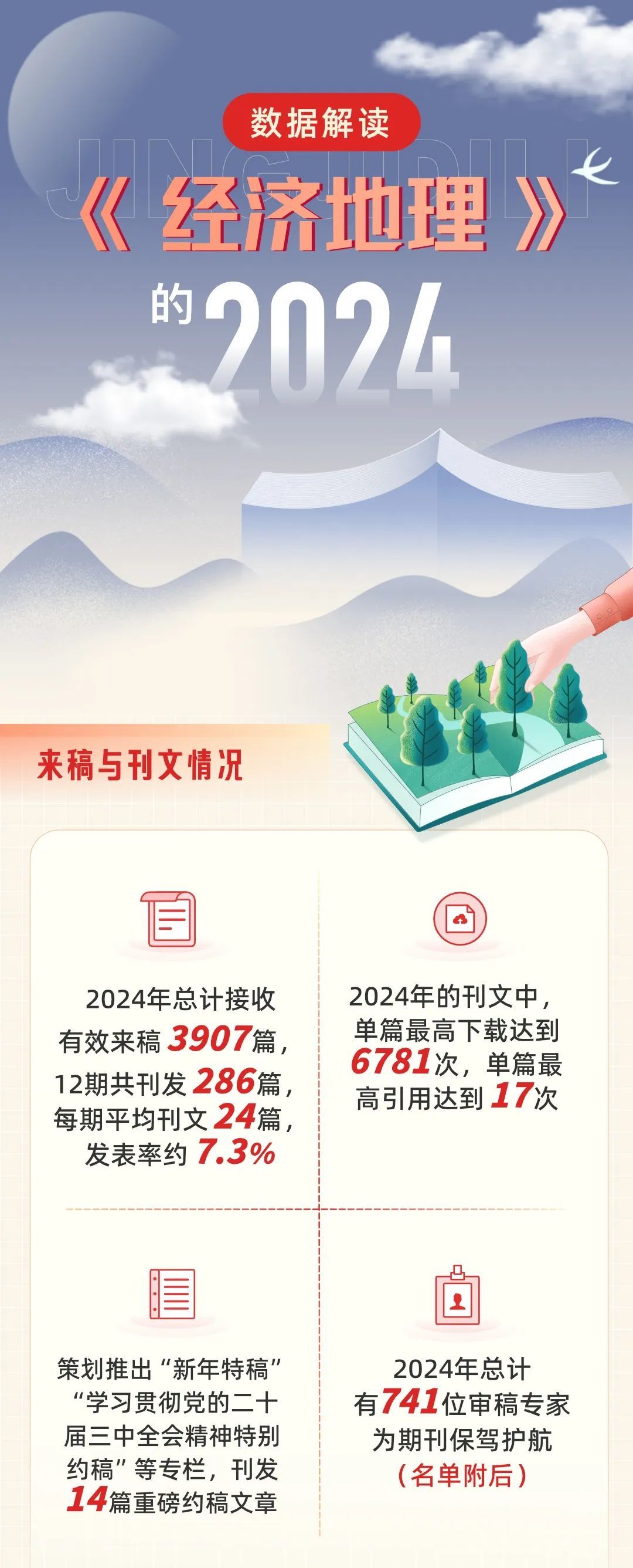 值此辞旧迎新之际,我们满怀感激之情,向关心、关爱《经济地理》发展的各界领导、顾问、主编、副主编、编委、青年编委、审稿专家以及广大作者和读者,致以最诚挚的问候和最温馨的祝福。过去的一年,对于《经济地理》而言,充满收获与喜悦,已经启航的2025年,是挑战与机遇并存的一年,我们将以“中国科技期刊卓越行动计划二期项目”为新起点,始终秉持“倡导和谐人地关系、服务社会经济建设”的宗旨,不断提升办刊质量与办刊水平,打造期刊学术命运共同体,共创中国经济地理学的美好未来!现在,请让我们通过一组数据,向大家汇报《经济地理》的2024年。