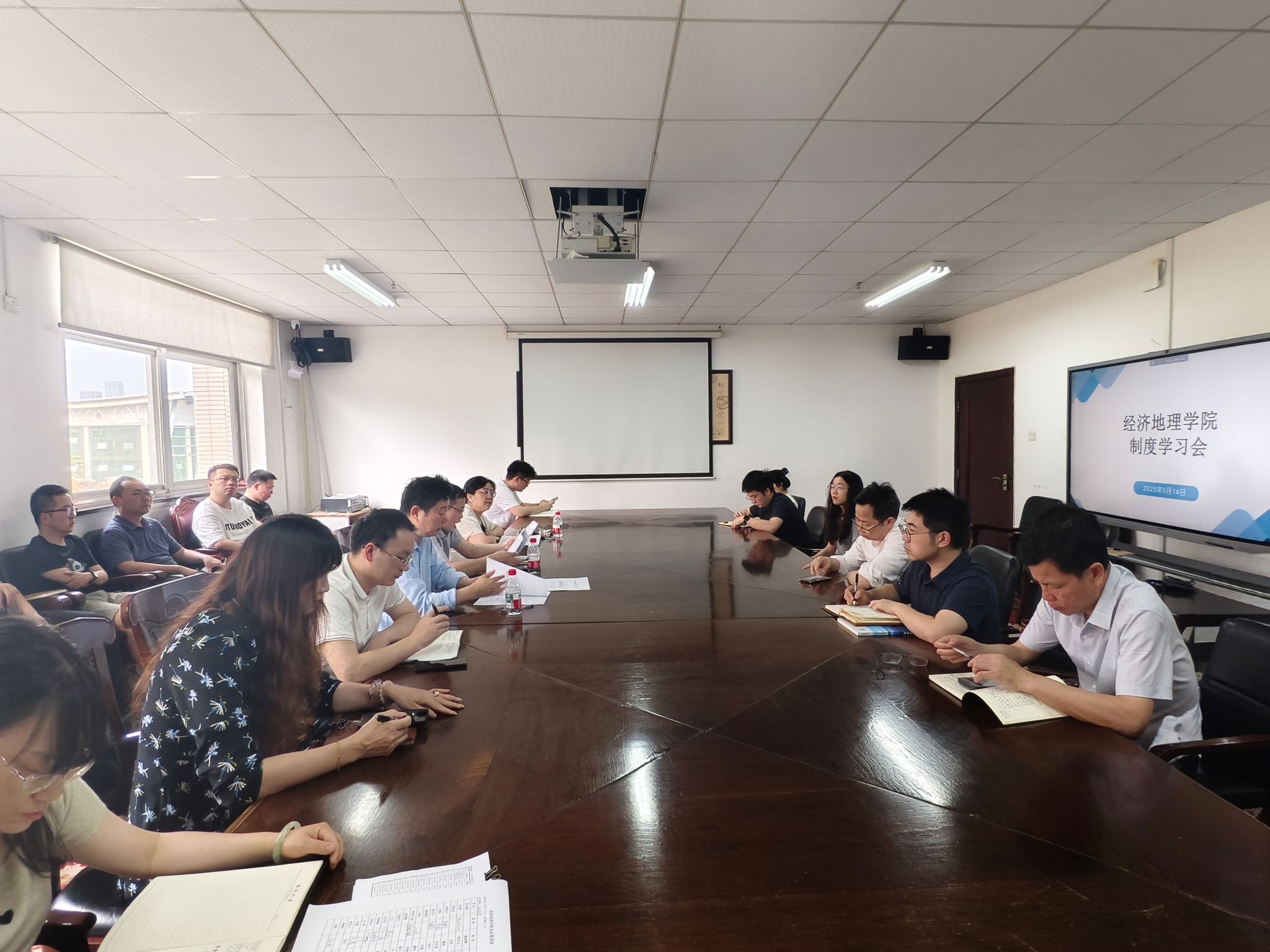 (本网讯)5月15日下午,经济地理学院在主校区办公楼515会议室召开制度学习会,系统解读学校新出台的管理制度,推进办学治院规范化进程。会议由副院长苏昌贵主持,院长彭文斌、院直属党支部书记姚旭辉及全体教职工参加会议。