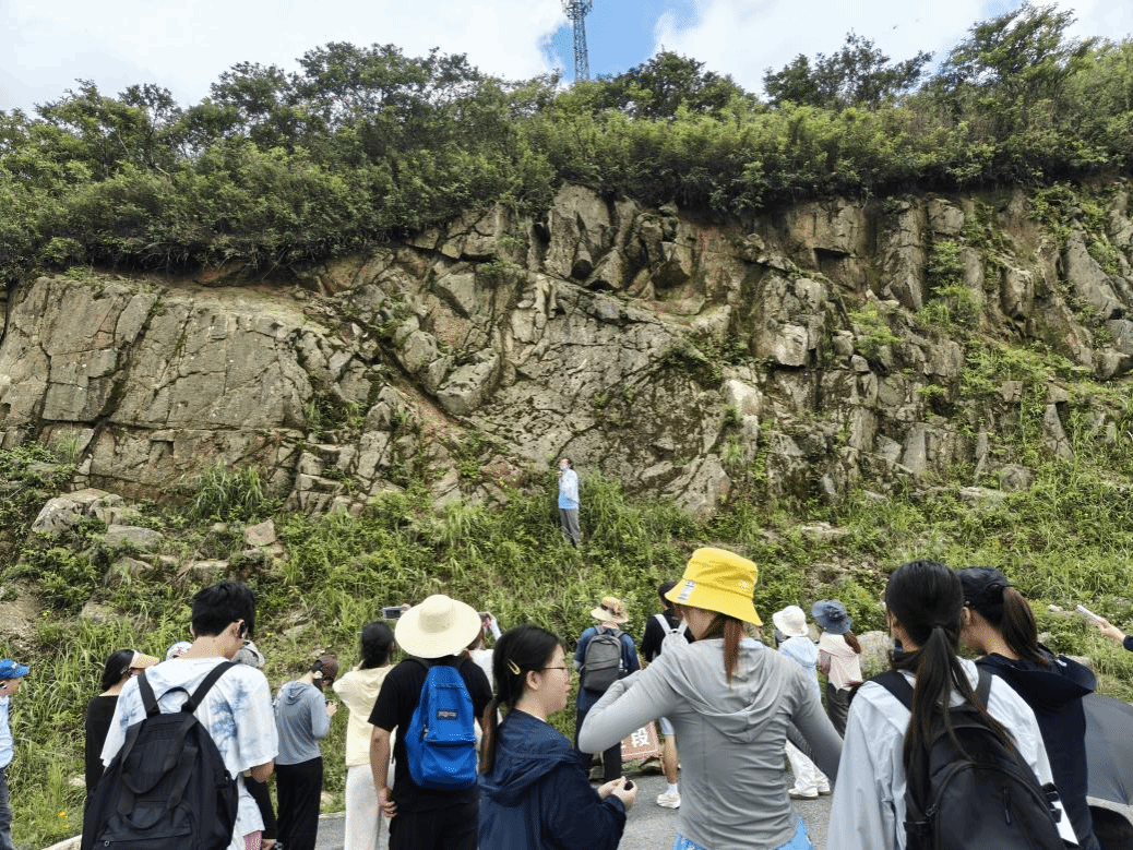 山川密码:自然要素协同下的地质地貌形成机制。大围山入口,苏昌贵副院长与陈超老师为实习队解析区域地质:地处扬子与华夏地台交界带,历经多期造山运动,主体由古老花岗闪长岩与变质岩构成。第四纪冰川侵蚀与现代流水作用叠加,形成陡峭中山地貌。苏昌贵副院长以口诀“太元古中新,震寒奥志泥石二三侏白”助记地质年代。