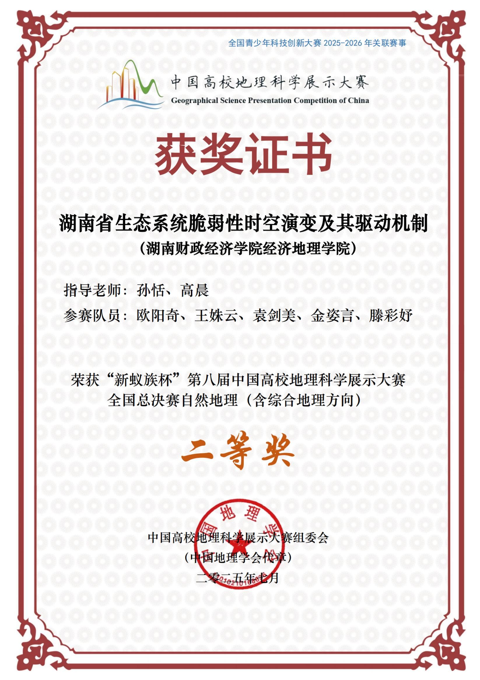 “地网奇点队”由2023级自然地理与资源环境专业欧阳奇、王姝云、袁剑美、金姿言和滕彩妤组成,孙恬和高晨担任指导老师。团队作品《湖南省生态系统脆弱性时空演变及其驱动机制》以湖南省作为研究区,深入分析了近几十年来生态系统脆弱性的时空演变,并探究了其驱动机制,为提升该区域生态涵养功能及推动经济绿色发展提供坚实的数据支撑与科学依据。